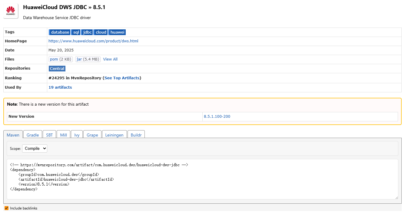 implementation("com.huaweicloud.dws:huaweicloud-dws-jdbc:8.5.1-200")