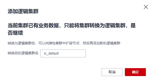 切换期间当前集群不可用,请耐心等待约2分钟(转换时间因业务数据量大小不同,有所差异),待逻辑集群页面出现lc1,表示转换成功。