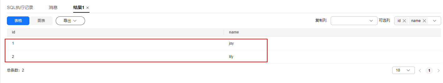 - 连接数据库后,以系统管理员dbadmin创建表name,并插入2条数据。