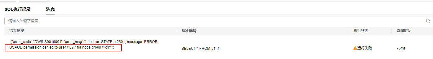 - 以用户u2登录数据库,查询原业务表t1数据,提示无权访问逻辑集群lc1。结果表明,即使用户u1已经授权了u2可以访问该表,但是由于这张表在不同的逻辑集群,所以仍然无法访问,证明逻辑集群间数据隔离。