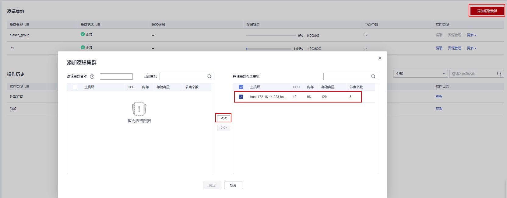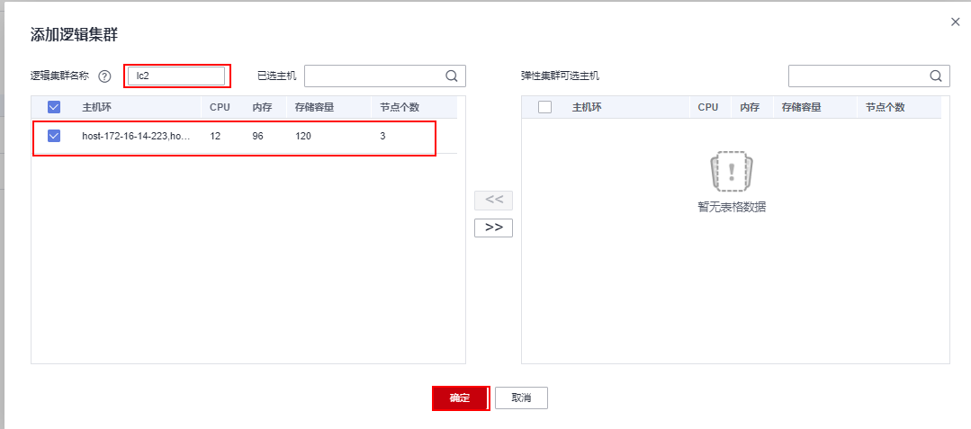 - 进入逻辑集群页面,单击右上角“添加逻辑集群”,从右侧勾选3个节点到左侧列表中,并输入逻辑集群名称lc2,单击“确定”。