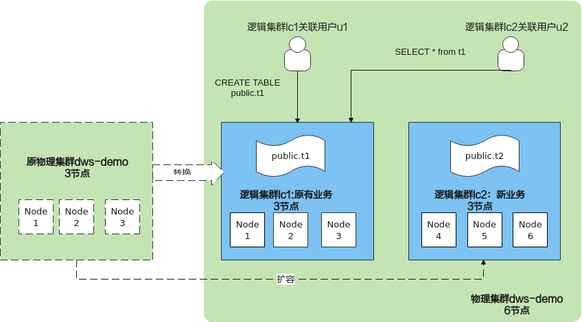 如图1所示,假设某企业原有业务数据表都在原物理集群dws-demo(绿色部分),切换到逻辑集群lc1(蓝色部分)后,物理集群再通过扩容方式,新增一套新的逻辑集群lc2,原有业务数据表统一切换到逻辑集群lc1,新的业务数据表统一写入到逻辑集群lc2,实现新老业务的数据隔离。而新的逻辑集群lc2关联的用户u2,通过授权可以跨逻辑集群访问逻辑集群lc1的表。