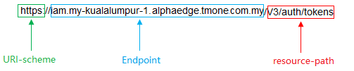 例如您需要获取IAM在“my-kualalumpur-1”区域的Token,则需使用“my-kualalumpur-1”区域的Endpoint(iam.my-kualalumpur-1.alphaedge.tmone.com.my),并在地区和终端节点的URI部分找到resource-path(/v3/auth/tokens),拼接起来如下所示。