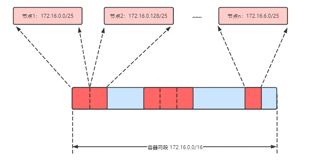 - 按节点维度划分地址段,集群的所有节点从容器网段中分配一个固定大小(用户自己配置)的IP网段。