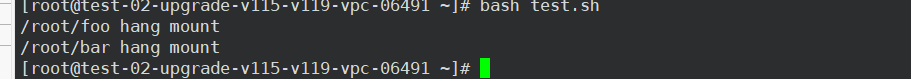 for mount_path in `cat /proc/self/mountinfo | awk '{print $5}' | grep -v netns` do timeout 10 sh -c "cd $mount_path" if [ $? == 124 ];then echo "$mount_path hang mount" fi done - 执行保存好的脚本,查看输出。