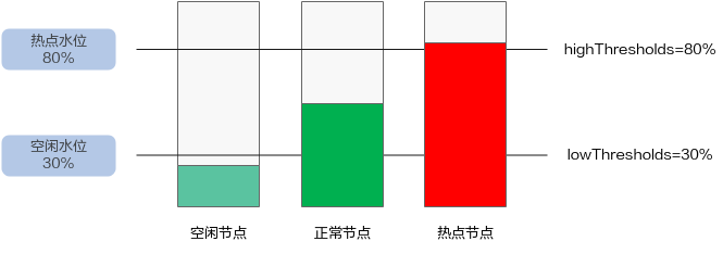- 正常节点:资源利用率大于等于30%且小于等于80%的节点。此节点的负载水位区间是期望达到的合理区间范围。