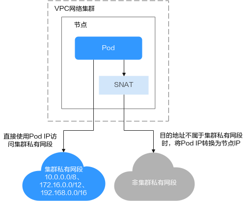 CCE提供nonMasqueradeCIDRs参数设置集群私有网段。在Pod中发起访问请求时,如果Pod访问的目的地址在集群私有网段范围内,则节点不会将Pod IP进行网络地址转换,可以借由VPC路由表直接将报文送达至目的地址,即直接使用Pod IP与集群私有网络地址进行通信。