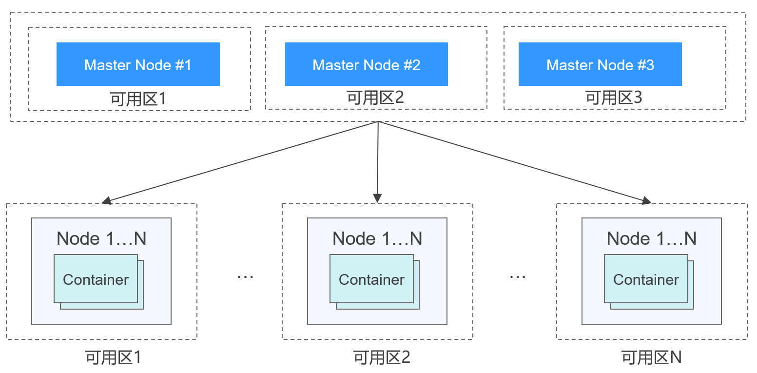 - 高可靠:集群管理面支持3 Master HA高可用,3个Master节点可以处于不同可用区,保障您的业务高可用。集群内节点和工作负载支持跨可用区(AZ)部署,帮助您轻松构建多活业务架构,保证业务系统在主机故障、机房中断、自然灾害等情况下可持续运行,获得生产环境的高稳定性,实现业务系统零中断。