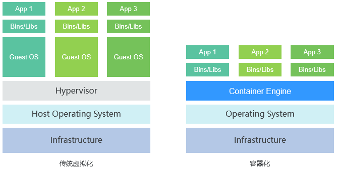 传统虚拟机技术通过Hypervisor将宿主机的硬件资源(如内存、CPU、网络、磁盘等)进行了虚拟化分配,然后通过这些虚拟化的硬件资源组成了虚拟机,并在上面运行一个完整的操作系统,每个虚拟机需要运行自己的系统进程。而容器内的应用进程直接运行于宿主机操作系统内核,没有硬件资源虚拟化分配的过程,避免了额外的系统进程开销,因此使得Docker技术比虚拟机技术更为轻便、快捷。