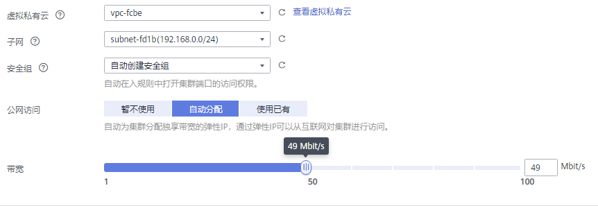 - 公网访问:选择“自动分配”为集群申请一个弹性IP作为集群公网IP。并且,在“带宽”参数中设置弹性IP的带宽。