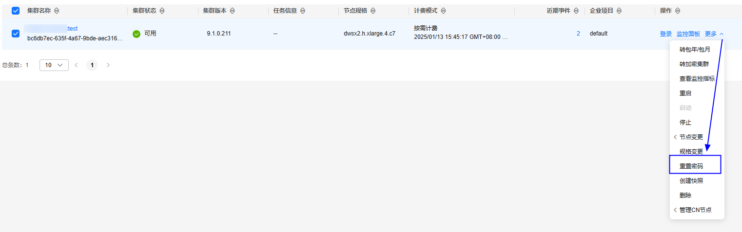 - 数据库管理员dbadmin的密码,可登录DWS控制台,选择集群所在行右边的“更多 > 重置密码”进行修改。