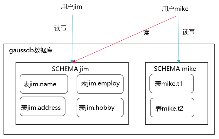 如图1所示,假设有两个用户jim和mike,对应的同名SCHEMA是jim和mike,用户mike需要访问SCHEMA jim的表(包括当前的某张表、所有表、未来创建的表)。