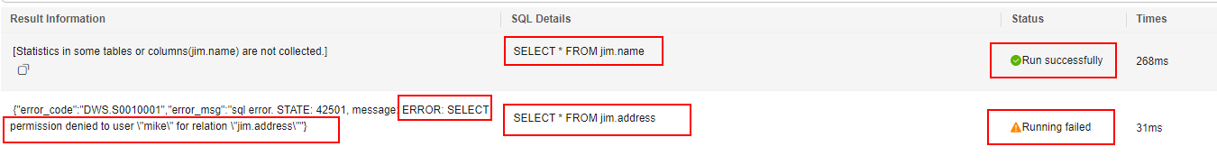 - 打开窗口2(即用户mike连接会话窗口,后续不再提示),使用用户mike连接DWS数据库,验证mike可以查询jim.name表,但是不能查询jim.address表。