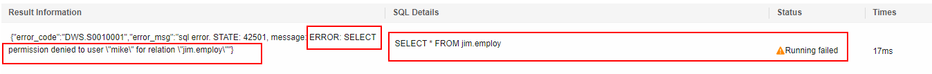 - 切换回窗口2,验证发现用户mike没有jim.employ的查询权限,说明mike虽然有SCHEMA jim下所有表的访问权限,但是对于赋权后新创建的表还是没有访问权限(即mike对SCHEMA jim未来的表权限是没有的)。