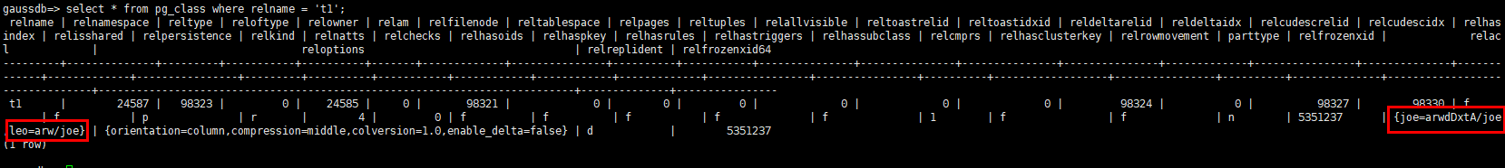 查看relacl字段,该字段回显结果如下,权限参数参见表2