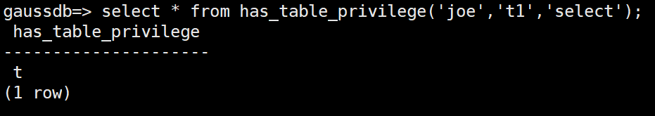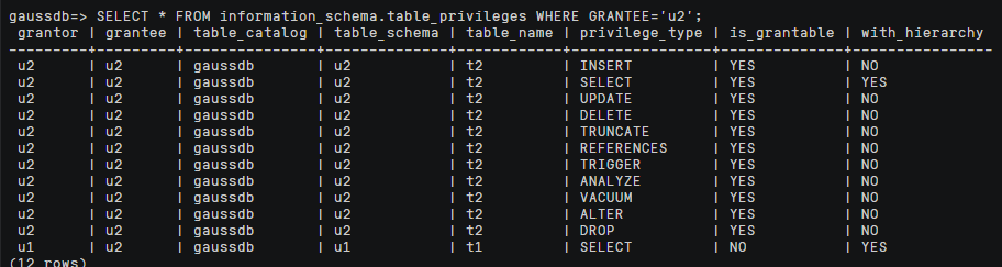 dbadmin | u1         | gaussdb       | public       | t1         | SELECT         | NO           | YES