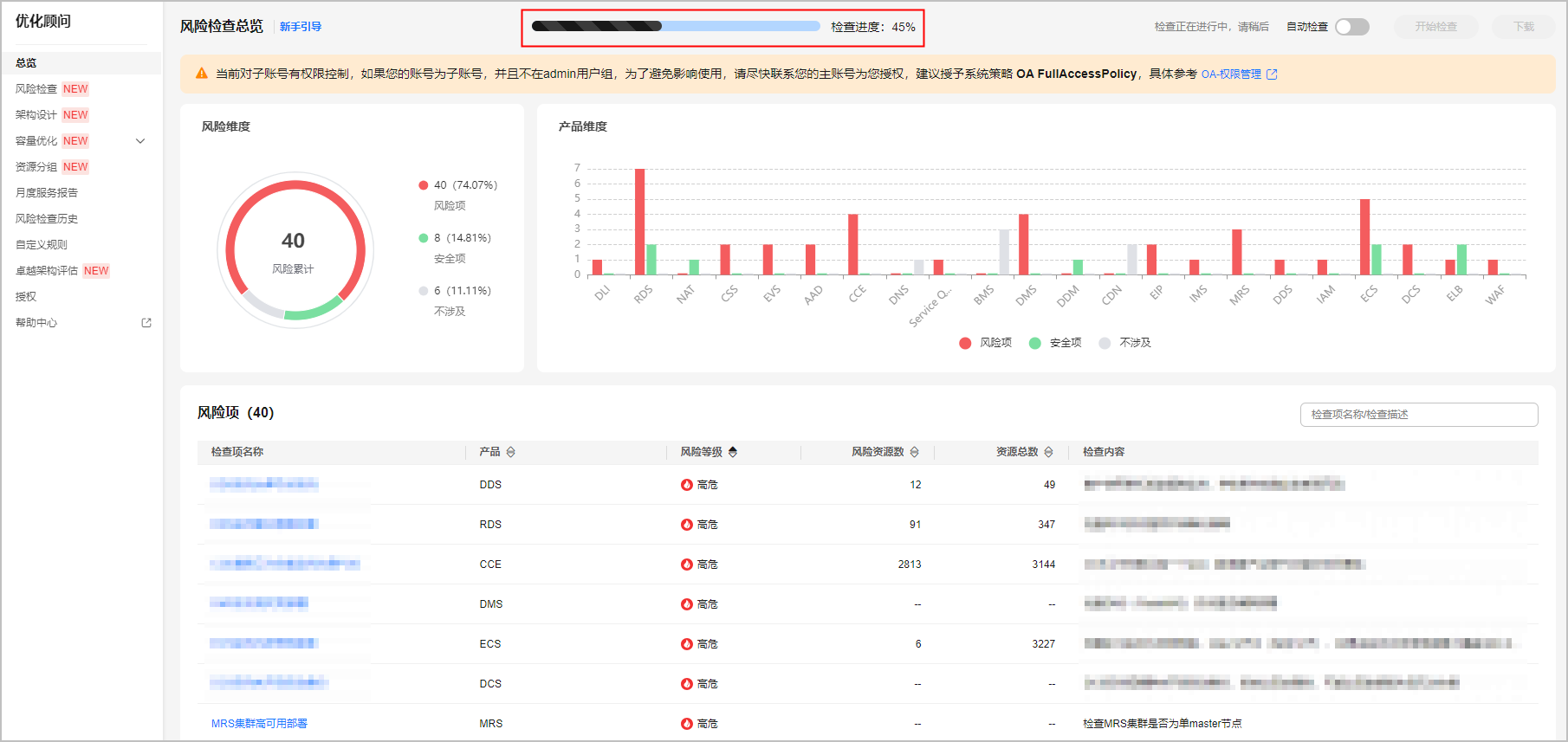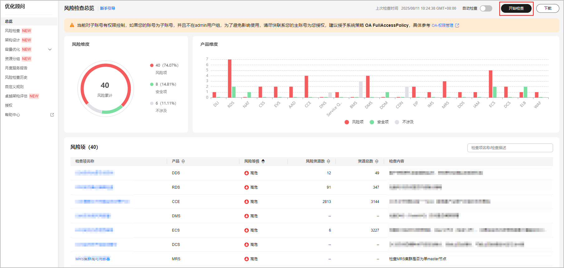 - 在“风险检查总览”页面,单击“开始检查”按钮,当检查进度为100%时检查完成。