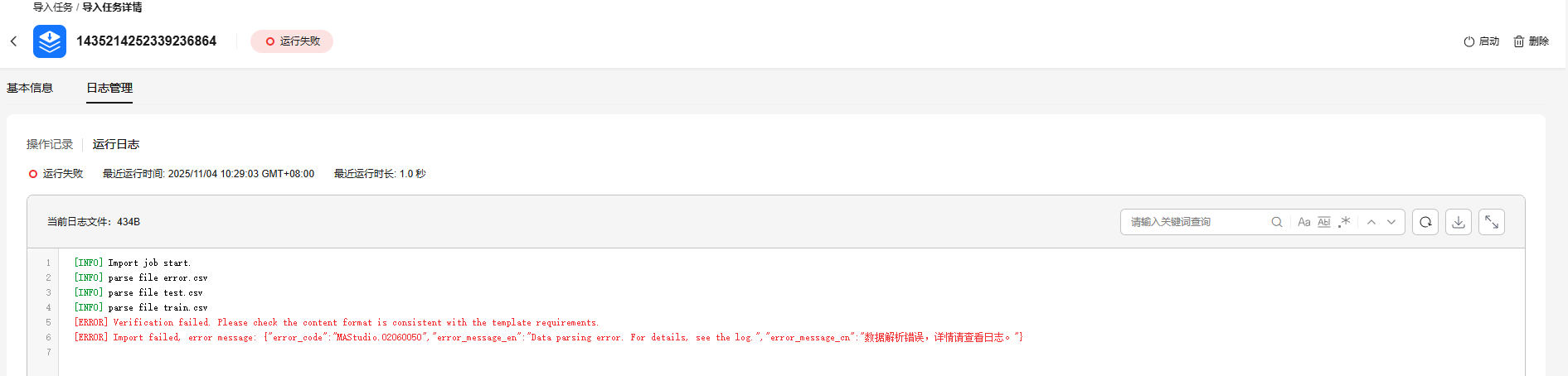 导入任务失败,日志中显示“数据解析错误”。