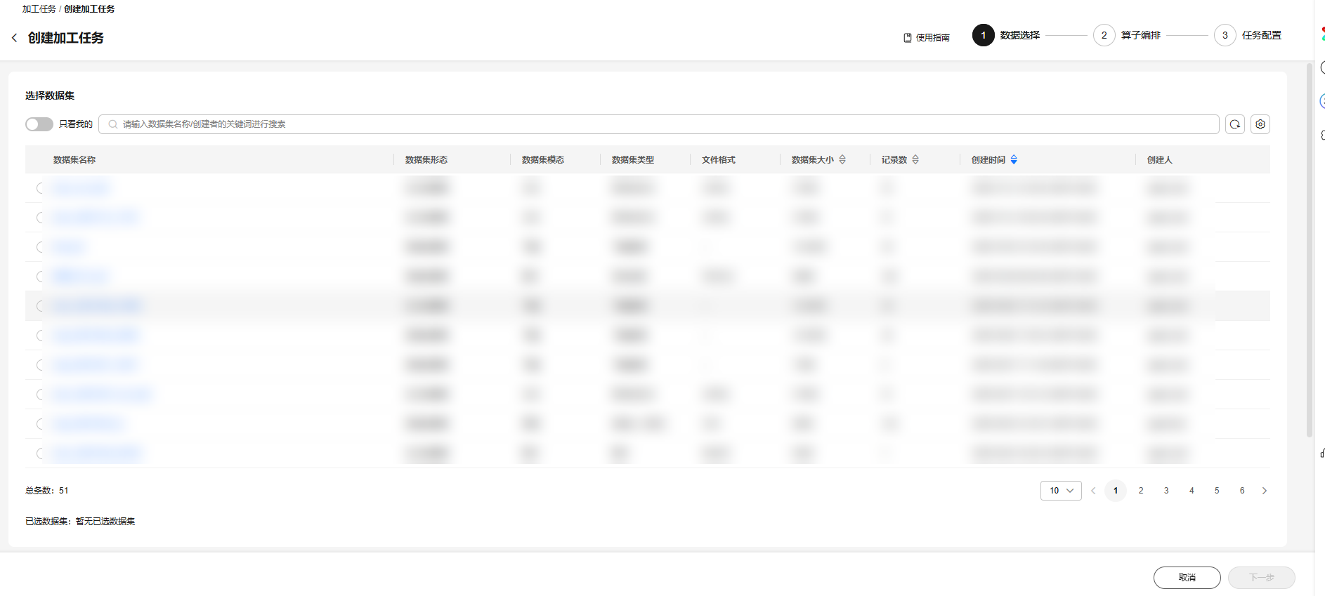 已在平台创建(导入、加工、发布)数据集,但是在创建加工任务的时候找不到已经创建的数据集。