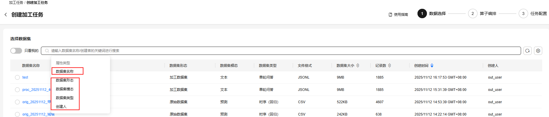 平台支持在创建加工任务的时候,筛选数据集。您可以通过数据集名称直接筛选出来,也可以通过数据集形态、数据集模态、数据集类型或创建人来筛选,这些筛选类型需要与您已创建的数据集的类型一致才可筛选出来。
