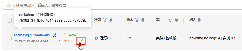 - 在RocketMQ实例列表页面如下图所示位置单击鼠标左键,复制实例的资源ID。