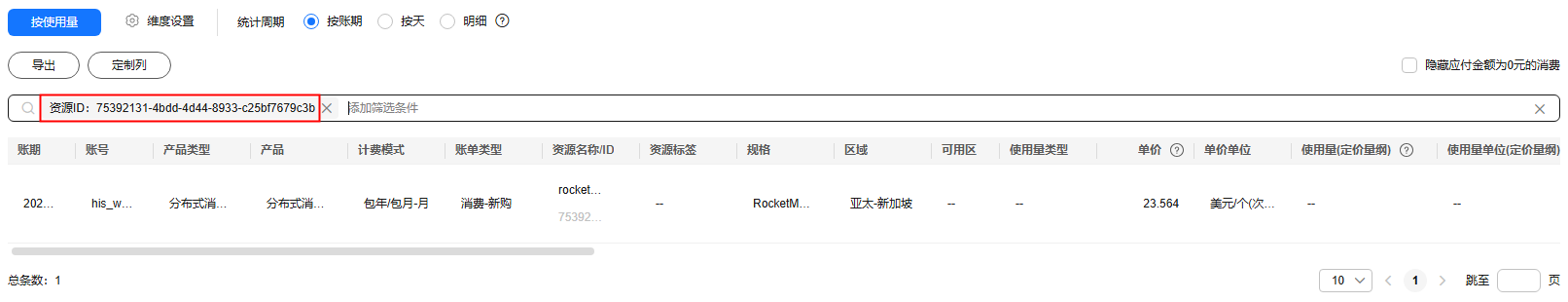 RocketMQ实例的实例费用和存储空间费用会分别上报一条账单到计费系统进行结算。查看指定资源的账单时,需要分别查看实例账单和存储空间账单。