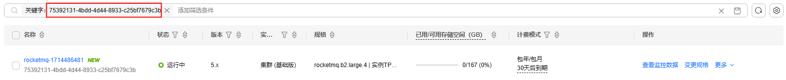 如果没有搜索到RocketMQ实例,可能是因为该实例已被删除,当前存放在回收站中。在回收站页面,单击RocketMQ实例名称,进入实例详情页,确认2中复制的资源ID是否为磁盘存储ID,如果是,此资源即为计费资源。如果不是,查看回收站中其他RocketMQ实例的磁盘存储ID,直到找到计费资源为止。