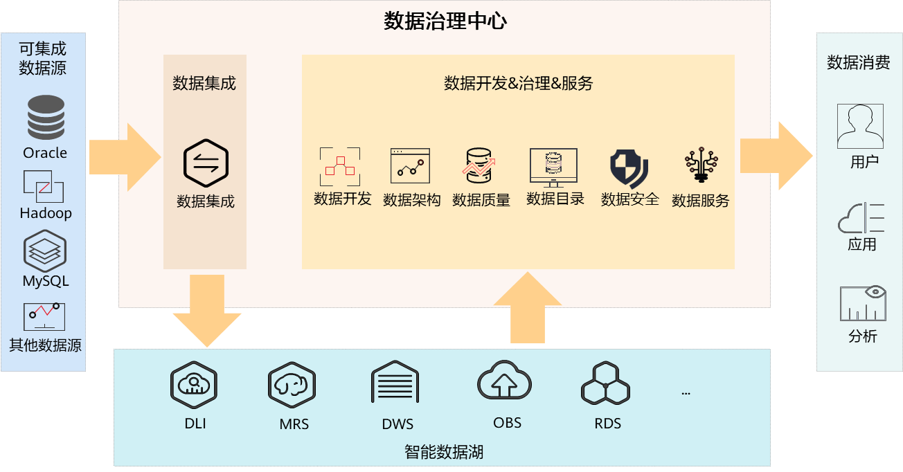 数据治理中心DataArts Studio是为了应对上述挑战,针对企业数字化运营诉求提供的具有数据全生命周期管理和智能数据管理能力的一站式治理运营平台,包含数据集成、数据开发、数据架构、数据质量监控、数据资产管理、数据服务、数据安全等功能,支持行业知识库智能化建设,支持大数据存储、大数据计算分析引擎等数据底座,帮助企业快速构建从数据接入到数据分析的端到端智能数据系统,消除数据孤岛,统一数据标准,加快数据变现,实现数字化转型。