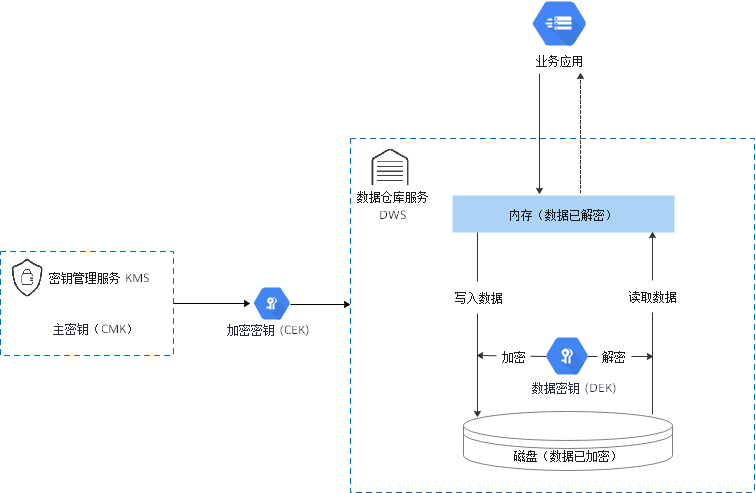 DWS数据库级透明加密,每个DWS集群有一个CEK,每个数据库单独配置DEK加密保护,DEK使用CEK加密保护,保存在DWS集群侧。密钥通过KMS服务申请和加解密,加密算法通过配置项统一配置。目前支持AES、SM4算法。