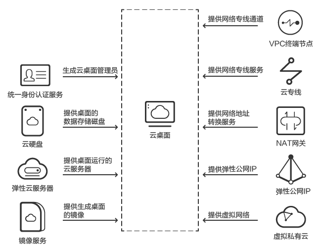 虚拟私有云(Virtual Private Cloud,VPC)提供和传统网络一样的虚拟网络以及先进的网络服务,如弹性IP、安全组和虚拟专用网。虚拟私有云在逻辑上实现网络隔离并且为云桌面提供安全、隔离的网络环境。为云桌面服务提供虚拟私有网络。