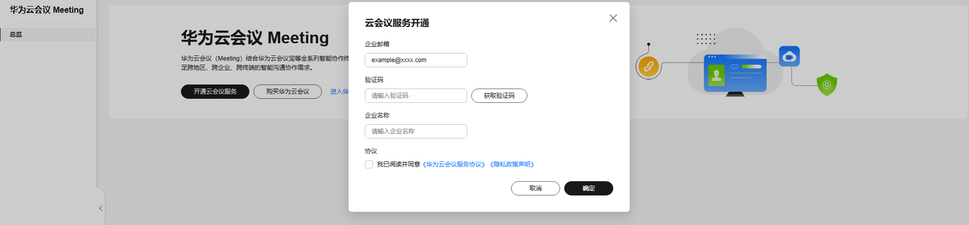 - 在控制台单击“开通云会议服务”,填写企业邮箱、验证码、企业名称,勾选协议并单击“确定”。