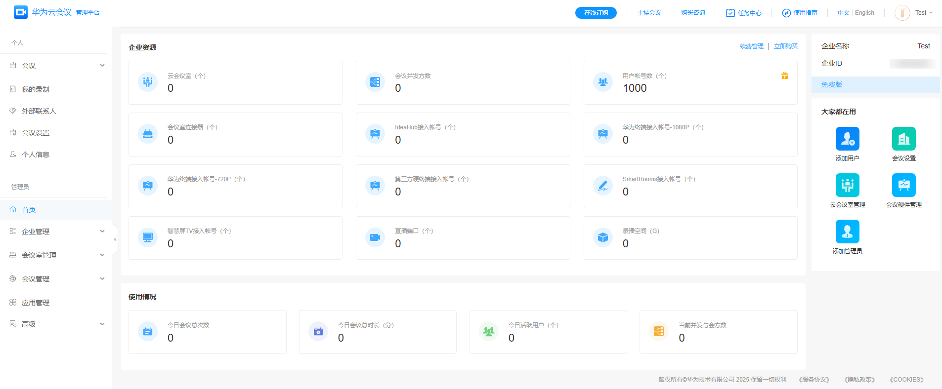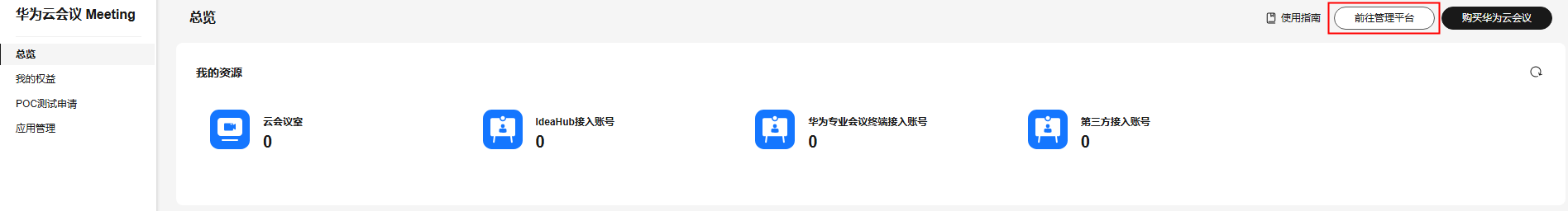 - 企业创建成功后,您将看到华为云会议管理平台入口,单击“前往管理平台”可跳转。