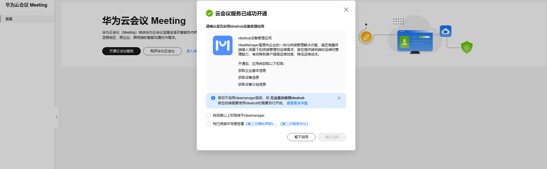 - (可选)根据提示勾选协议并单击“确认启用”,可以启用IdeaHub设备管理应用。