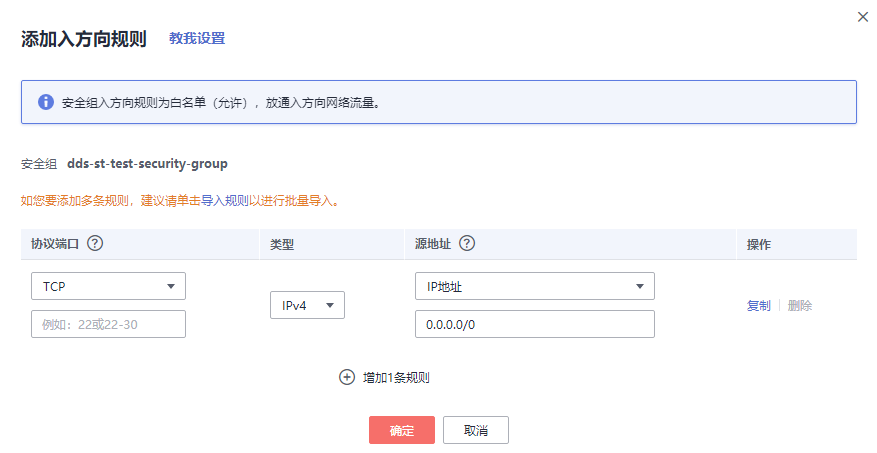 - 单击“添加规则”,弹出添加入方向规则窗口。
