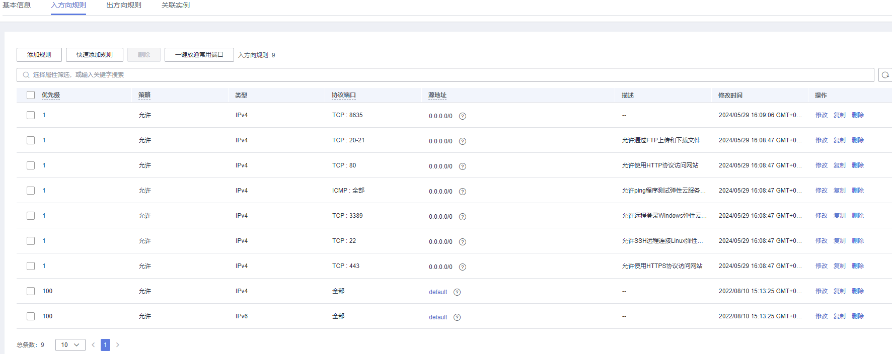 源地址:可以是IP地址、安全组、IP地址组。用于放通来自IP地址或另一安全组内的实例的访问。例如:- 192.168.10.10/32(IPv4地址)