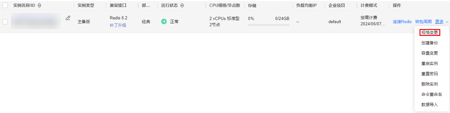 - 在“实例管理”页面,选择指定的实例,在操作列单击“更多 > 规格变更”。