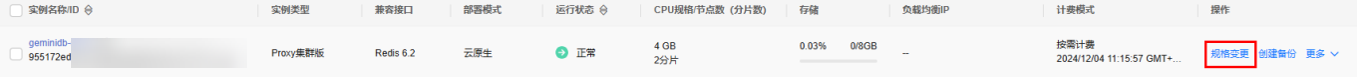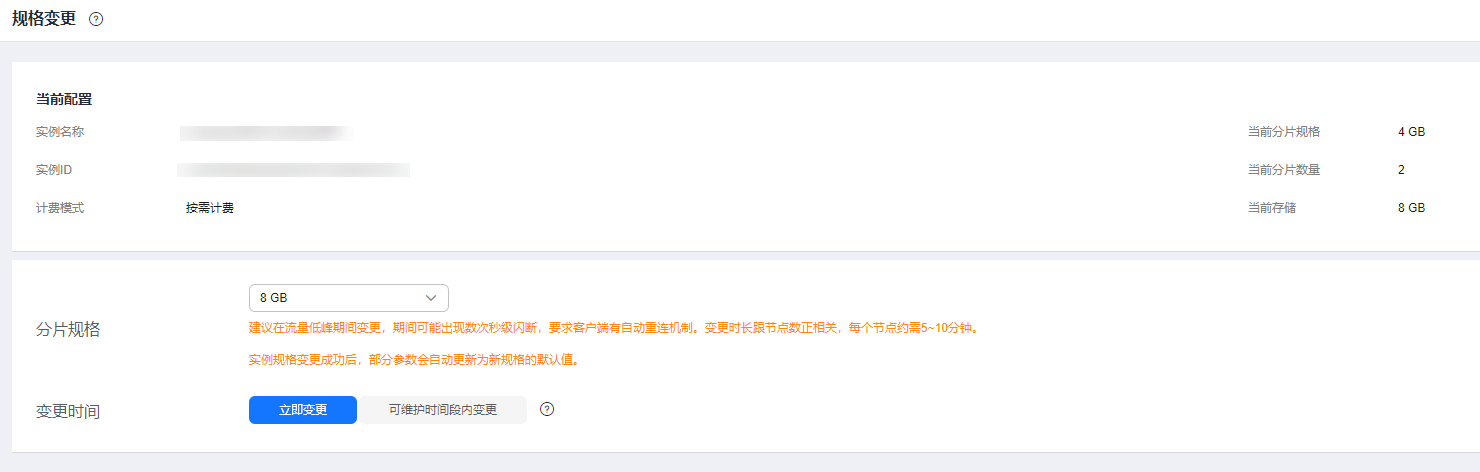 - 云原生部署模式的标准型实例规格变更后,系统会自动调整存储容量至分片数*分片规格(GB)。