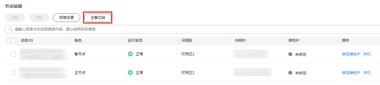 - 在左侧导航栏单击“节点管理”,在“节点信息”区域,单击“主备切换”,进入“主备切换”页面。