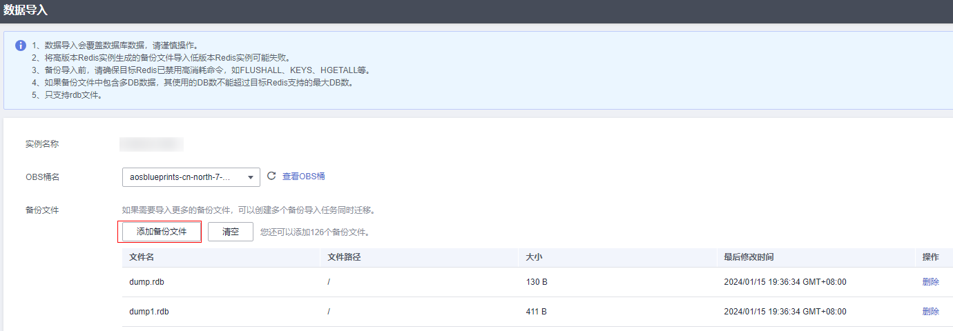 - 将高版本Redis实例生成的备份文件导入低版本Redis实例可能失败。