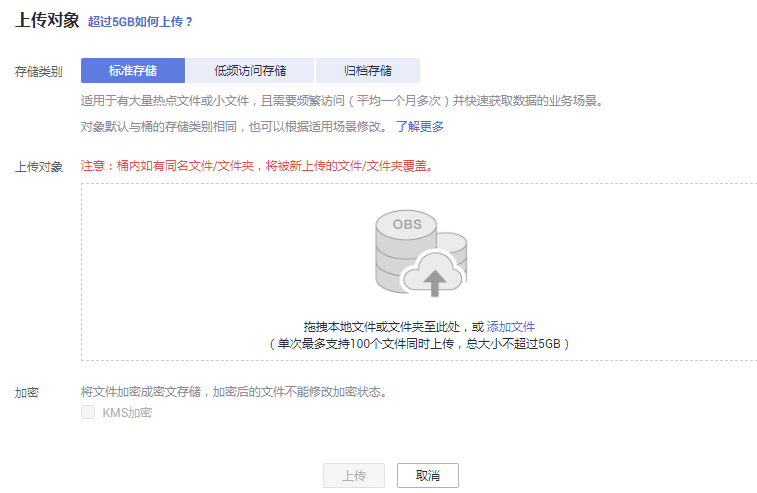 - 可选:勾选“KMS加密”,用于加密上传文件。