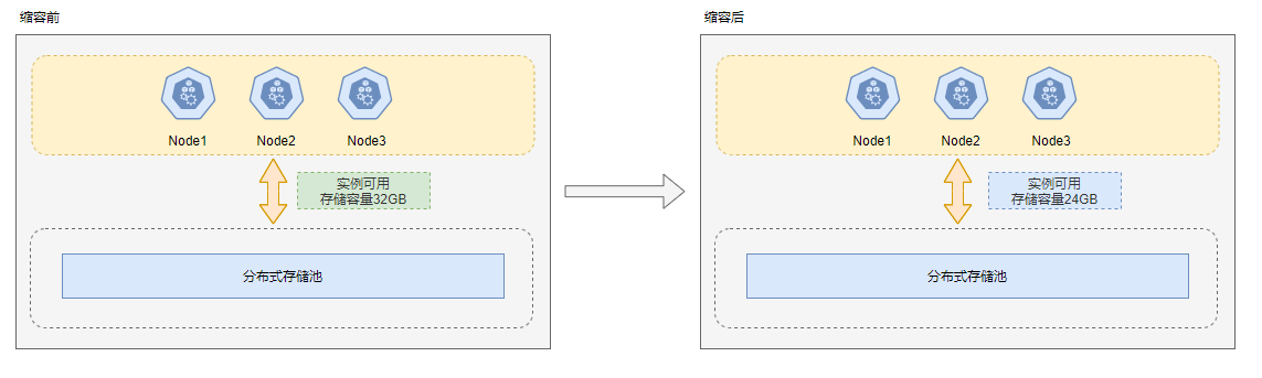 以经典部署模式实例为例,假设缩容前实例存储为32GB,用户缩容8GB,则缩容后,实例存储空间为24GB。