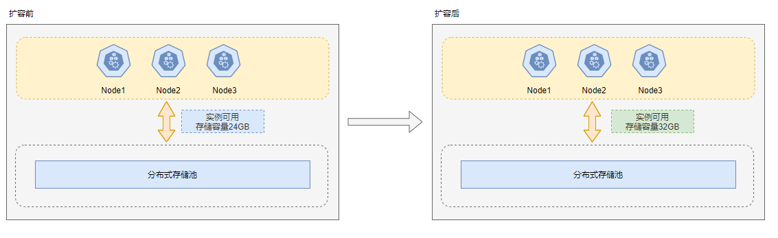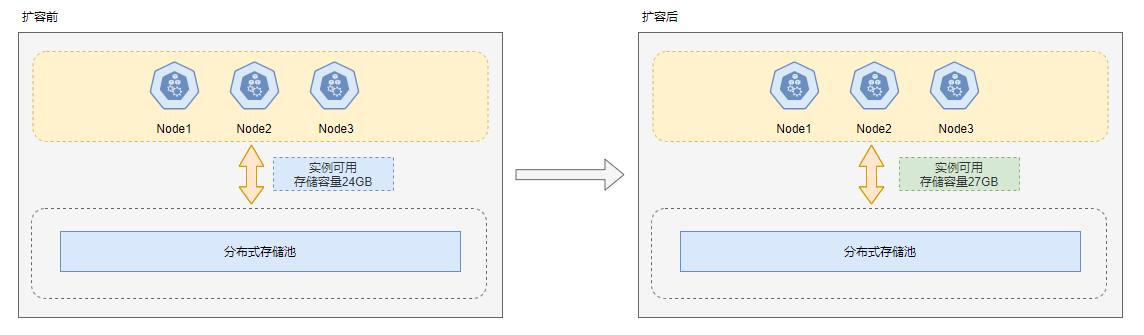 以经典部署模式实例为例,假设扩容前实例存储为24GB,用户扩容8GB,则扩容后,实例存储空间为32GB。