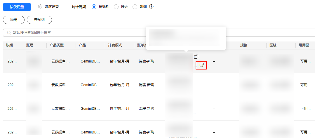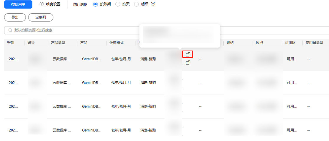 - 选择“账单管理 > 消费详情”,在如下图所示位置单击鼠标左键,复制资源ID。