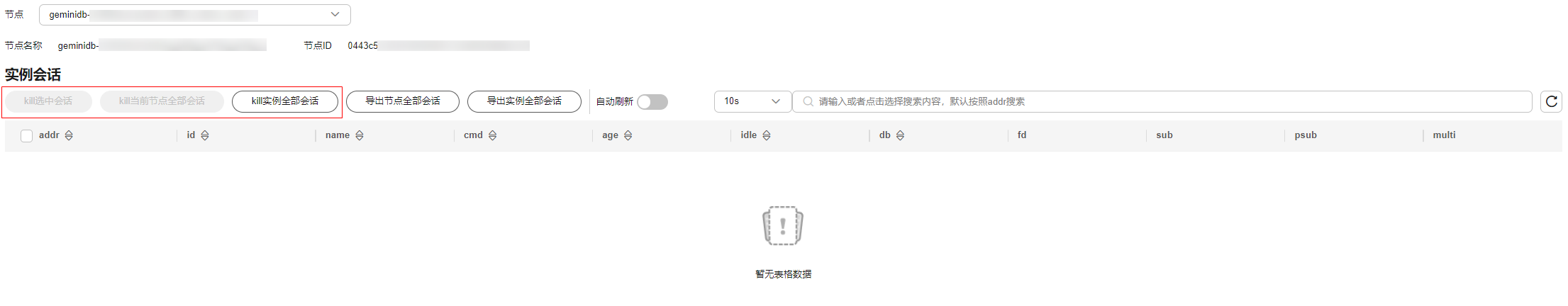 您可以单击“kill选中会话”、“kill当前节点全部会话”或者“kill实例全部会话”,结束选中的会话或者结束节点、实例全部的会话。