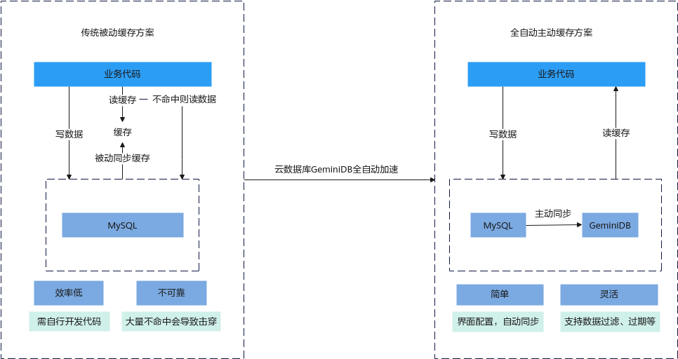 内存加速是GeminiDB Redis为了优化“传统被动缓存方案”而推出的功能,它可以让用户通过界面配置规则的形式,自动缓存MySQL的数据,加速MySQL的访问。