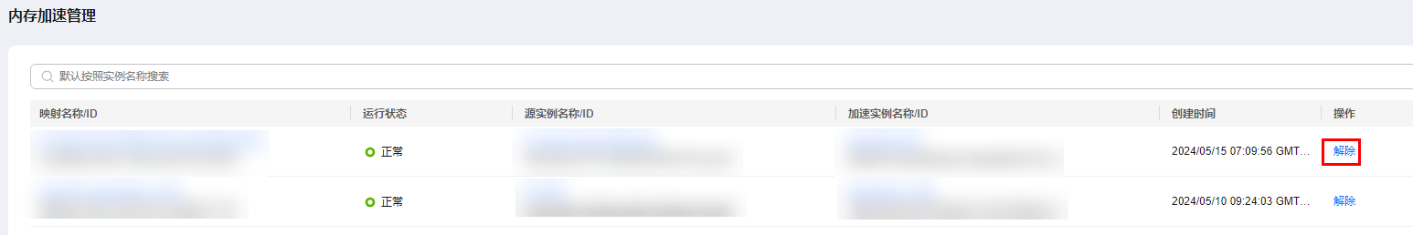 - 在左侧导航栏选择“内存加速管理”,可以在“内存加速管理”页面查看全部映射关系,也可以在通过搜索关键字(如映射名称、映射ID等),找到具体的映射。