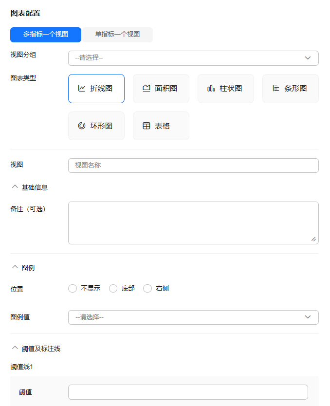 - 在右侧图表配置页签,根据需要选择“单指标一个视图”或“多指标一个视图”,在视图分组下面选择已有的分组,或单击“新建分组”重新创建。