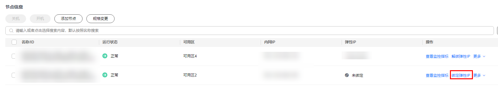 - 在节点的“弹性IP”列,查看绑定成功的弹性公网IP。