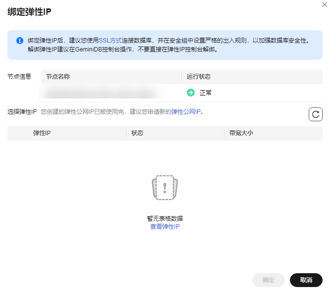 - 在弹出框列表中,显示“未绑定”状态的弹性公网IP,选择所需绑定的弹性公网IP,单击“是”,提交绑定任务。如果没有可用的弹性公网IP,单击“查看弹性IP”,创建新的弹性IP。