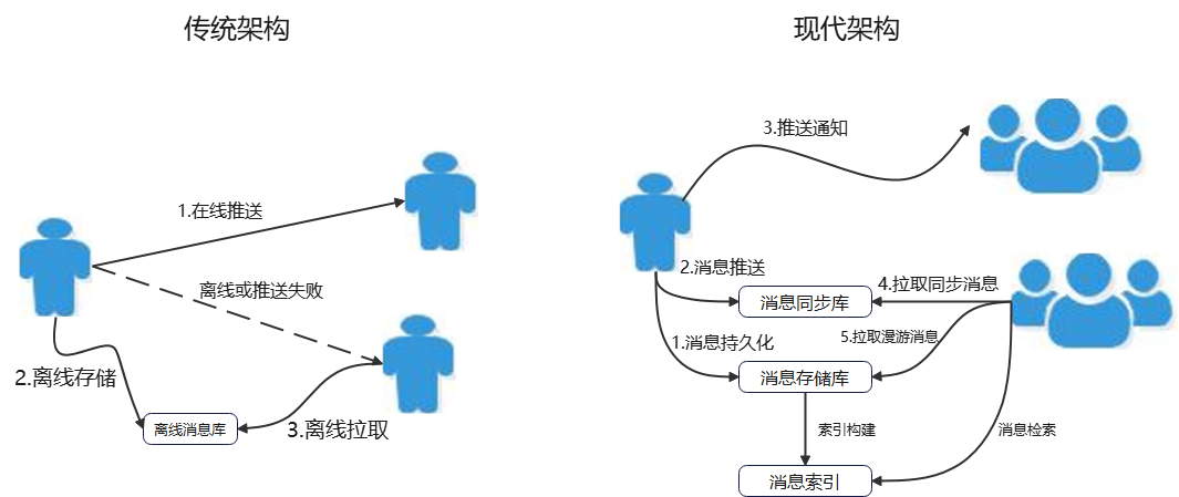 - 划分消息存储库与消息同步库。消息存储库用于全量保存所有会话消息,主要用于支持消息漫游。消息同步库,主要用于接收方的多端同步。